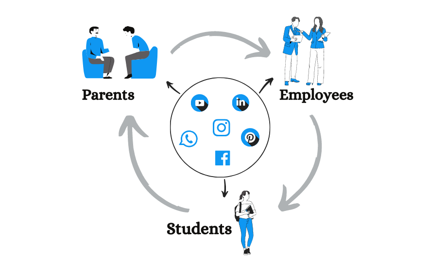 Education Institutes Information Management System (EIIMS) is able connect to Students, Employees and Parents through social medial. Social media is the social interaction among people in which they create, share or exchange information, ideas, and pictures/videos in virtual communities and networks. Andreas Kaplan and Michael Haenlein define social media as "a group of Internet-based applications that build on the ideological and technological foundations of Web 2.0, and that allow the creation and exchange of user-generated.